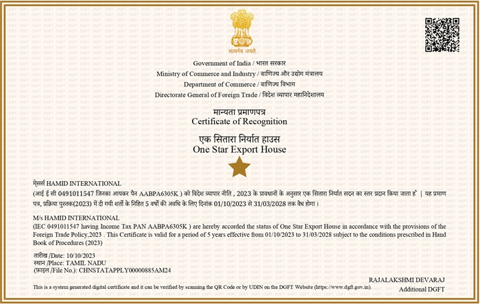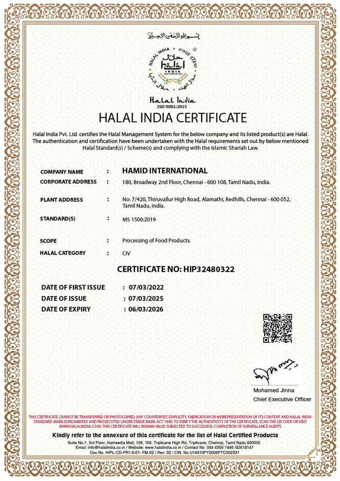HAMID INTERNATIONAL is an ISO 9001:2015 and HALAL Certified Exporter. Over a decade, having happy clientele in Malaysia, Singapore, SriLanka, Brunei, Indonesia, Phillippines, China and the Gulf region.